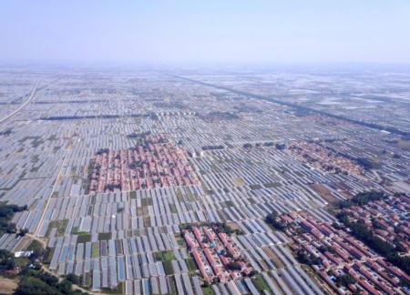 从空中俯瞰,寿光这片区域相较周边微微泛白,连片的蔬菜大棚星罗棋布,密密麻麻排列在寿光的土地上,就像“白色海洋”。