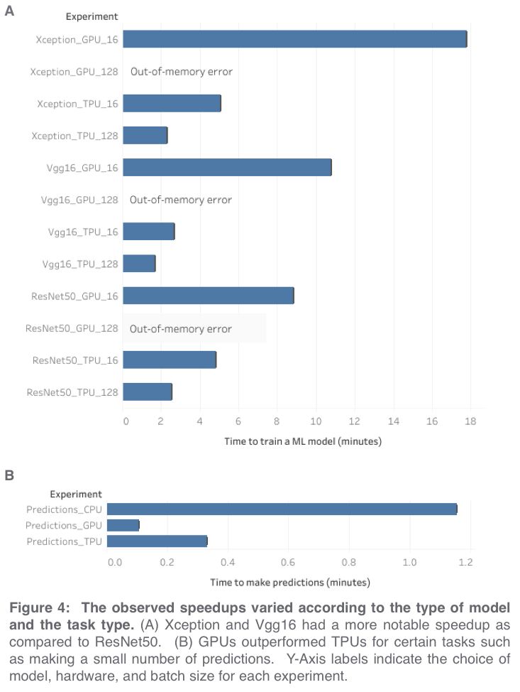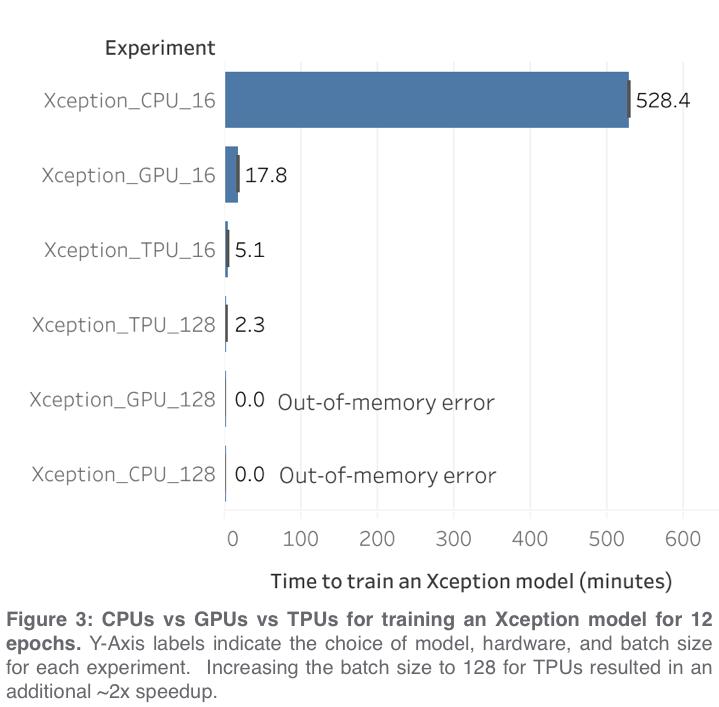 在下图 3 第一个实验中,我们在三种硬件上运行了相同的代码(官方教程笔记中的改进版),并且为了避免 CPU 和 GPU 出现内存不足的问题,batch size 也设置得很小(设为 16)。在这种情况下可以看出,训练 Xception 模型时,TPU 比 CPU 快了约 100 倍,比 GPU 快了约 3.5 倍,这是因为 TPU 处理批大小很大的数据时效率更高。我们也试着将 batch size 增加到 128,结果发现 TPU 速度快了 2 倍,GPU 和 CPU 均出现了内存不足的问题。所以,与之前的实验相比,TPU 训练 Xception 模型的速度比 GPU 快 7 倍。