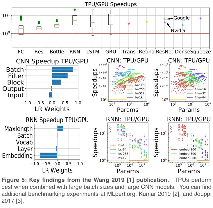 为了使结果更为充分,我们注意到 Yu Emma Wang 等人 [1] 开发了一个叫做 ParaDnn 的严格基准,这一基准可以用来比较不同硬件训练机器学习模型时的性能。利用 Yu Emma Wang 等人 [1] 的方法,可以总结出:用 TPU 代替 GPU 时,参数化模型性能可以提升 1 到 10 倍,使用模型的性能也可以提升 3 到 6.8 倍(下图 5)。分片数据、很大的数据批和大模型结合在一起时,TPU 是最佳选择。