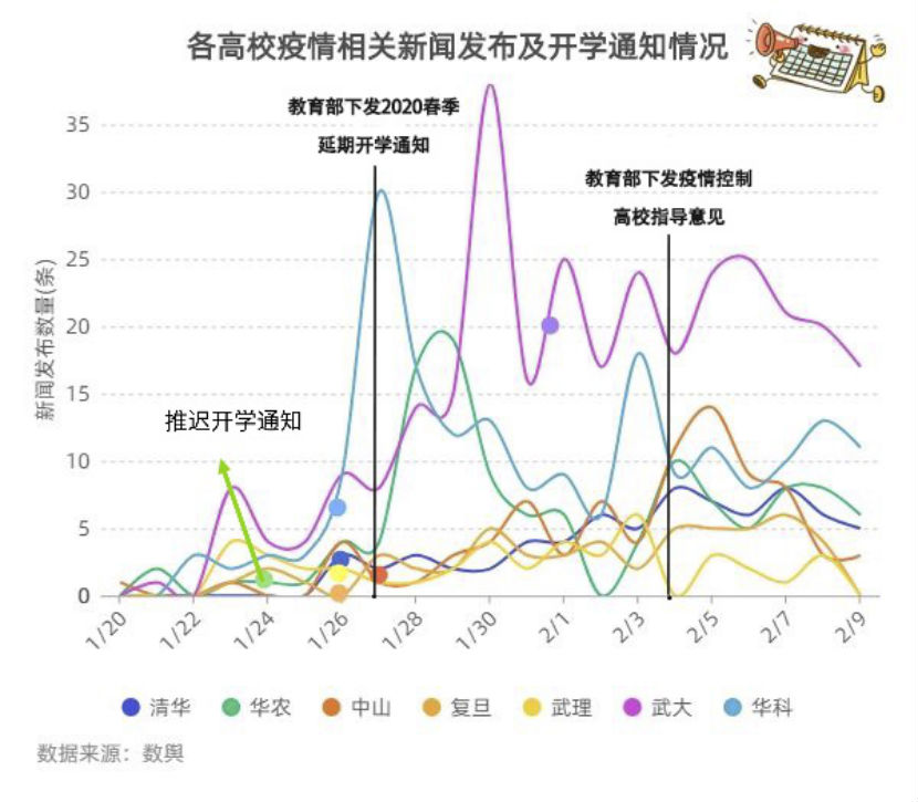 受到疫情影响,开学带来的学生流动和学生聚集势必会带来极高的隐患。因此,许许多多高校都选择了延迟开学。16所高校中,华农首先在1月24日发布了延迟开学通知,紧随其后的是华科、清华、武理、复旦、中南财经政法五所高校,它们都在1月26日这天发布了延迟开学通知,随后是地大、同济、中大、浙大四所高校,选择在教育部下发延迟开学通知的同一天发布了通知,暨大、北大、华南理工三所高校也在一月结束之前依次发布了通知,而武大、华中师范和华南师范在2月初才正式发布了延迟开学通知。