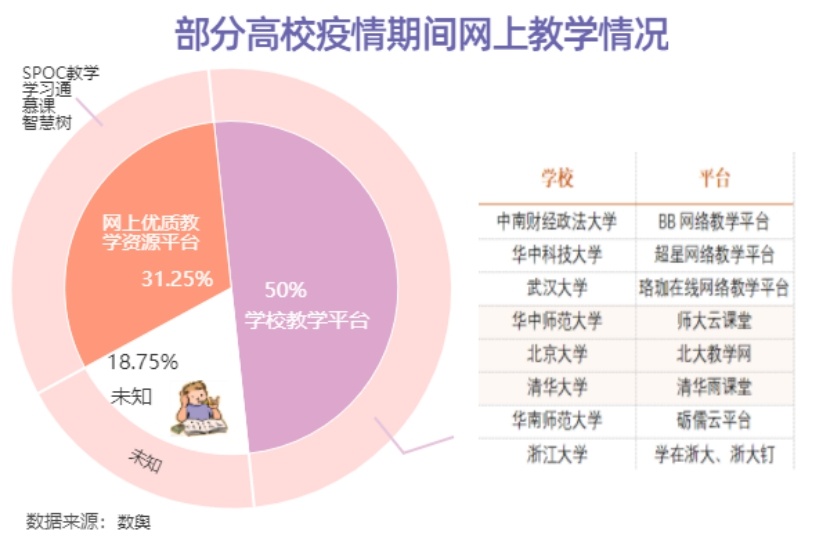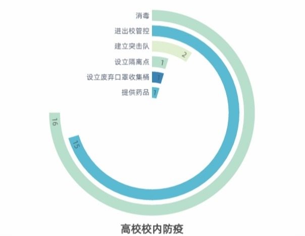 尽管延迟了开学,但在疫情期间学习也是刻不容缓。部分高校均通过不同平台开展了网上教育。在这16所高校中,利用自身教学平台对学生展开授课的高校占五成,如武汉大学的珞珈在线网络教育平台、华中师范大学的云课堂、北京大学的北大教学网等等。通过自身教学平台对学生学习进行统筹,顺应学生已有学习习惯,在某种程度上减少了教学混乱发生的几率。此外,还有近三成的高校运用网上优质教学资源平台对学生进行授课,也不失为灵活利用资源、积极进行教学的好方法。防疫措施多