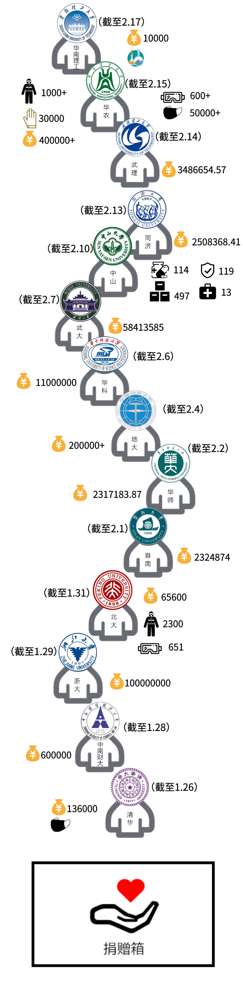 高校伸援手疫情面前,各大高校纷纷伸出援助之手,全全国各地的校友及校友企业纷纷慷慨解慷慨解囊,向抗击疫情前线捐款捐物。