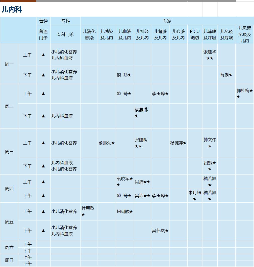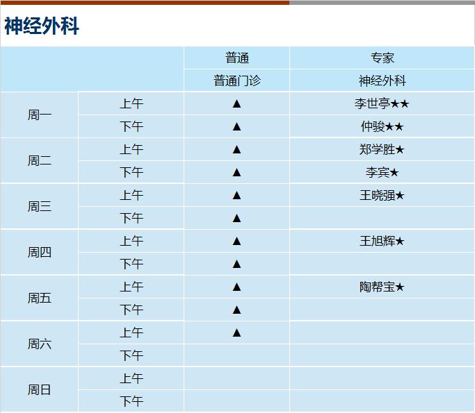 心血管科、内分泌科、呼吸科、神经内科、消化科、肾内科、全科医学、风湿免疫科、肿瘤科、血液科、普通外科、骨科、泌尿外科、神经外科(周一下午、周三下午、周五全天)、胸心外科(周二下午、周三下午、周四全天、周五下午)、产科(上午)、妇科、生殖医学、儿科、皮肤科、心身科、中医内科、中医伤科、中医肛肠、中医针灸、康复科、放疗科、介入(周五下午)