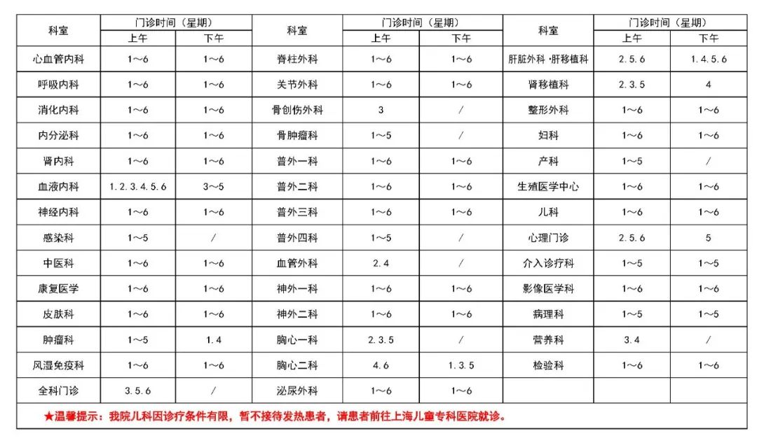 1)耳鼻咽喉科:门诊暂停;陆家嘴院区急诊24h开诊;世博院区急诊8:00-17:00(周一~周五)
