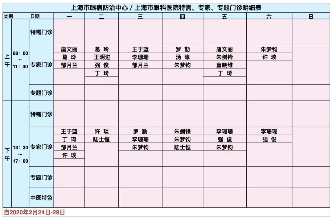 上海市眼病防治中心(上海市眼科医院)2020年2月-3月(2月从24日起)门诊排班表,大家可以通过上海市眼病防治中心官方微信公众号、自助挂号机、医联预约平台等进行快速预约!
