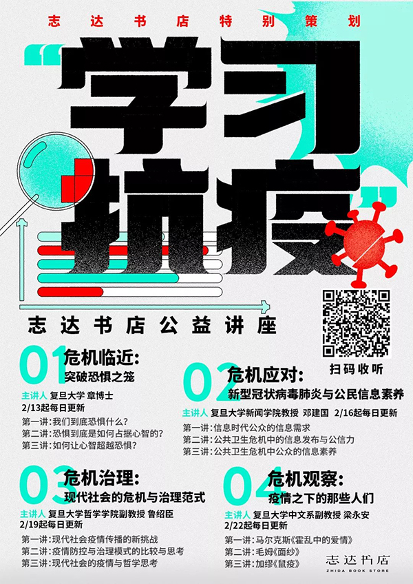到了2月份,志达书店针对疫情又做了“学习抗疫”特别策划,邀请来自复旦大学的章博士、邓建国、鲁绍臣、梁永安,分别从心理学、新闻传播学、哲学、文学这四个角度讲解疫情。