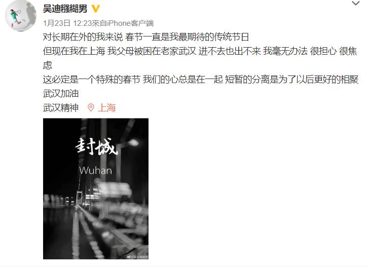 对于这座正在遭遇困难的城市,吴迪也希望大家能多一份善意——“武汉人真的很不容易,请大家多理解他们。”