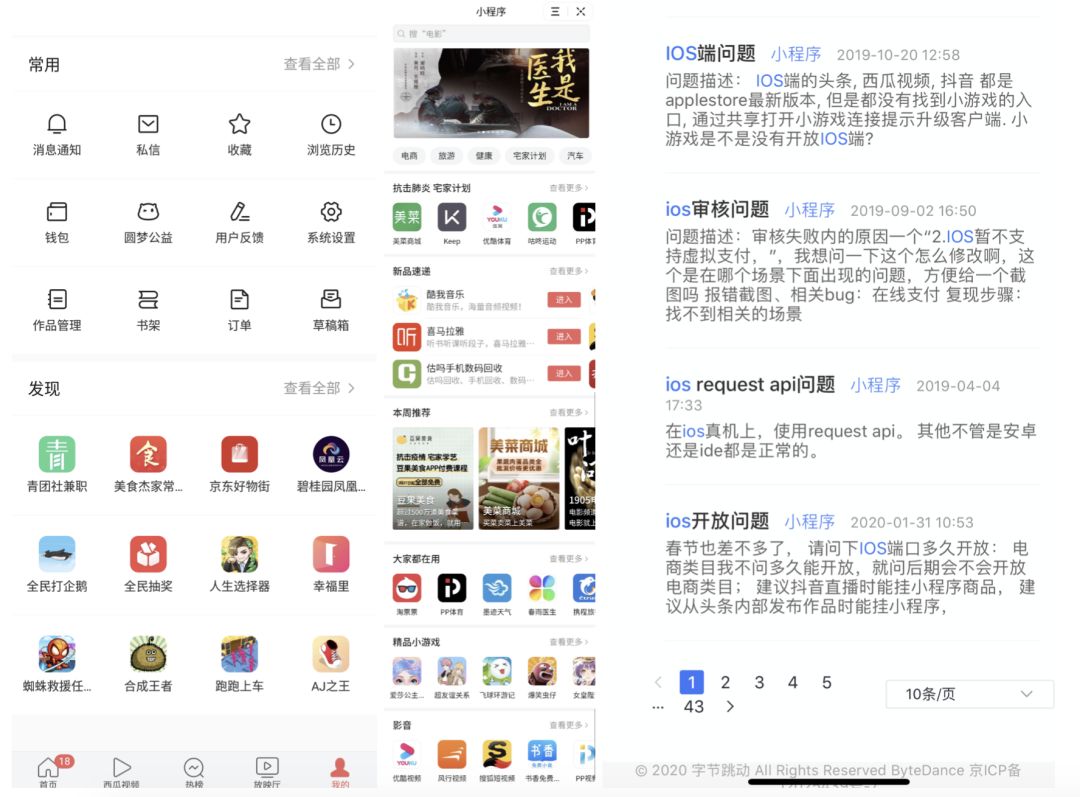 2018年,今日头条赶在风口上线小程序,以小游戏居多。随着后来今日头条的策略变化,小程序的打开位置从搜索页变更为个人中心的发现页。并且在2019年1月,今日头条小程序曾在iOS端下线,对此字节跳动曾回复36氪,“苹果版因为产品版本迭代正在调整,不久即可恢复;安卓版本可以无障碍使用。”