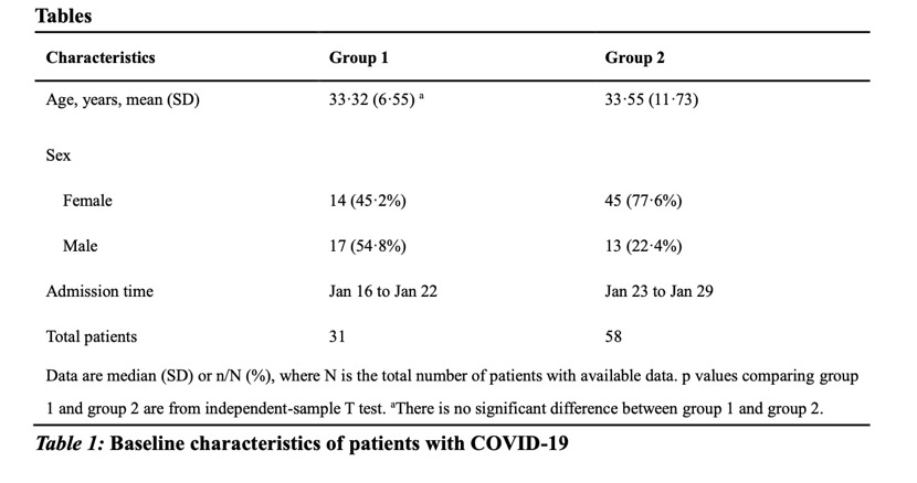 该论文的研究样本是从1月16日到1月29日间入院的89名确诊的新冠肺炎患者。根据入院时间,他们被分成2组:第1组是1月16日至22日的31名患者;第2组是1月23日至1月29日的58名患者。