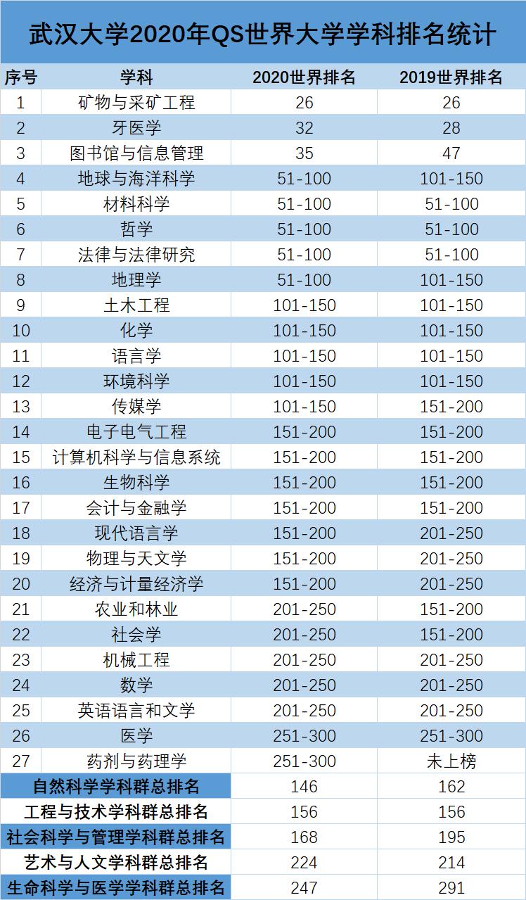 武汉大学共有27个学科上榜,较去年增加1个;3个学科跻身世界50强,其中矿业工程排名第26位,牙医学排名第32位,图书馆和信息管理排名第35位。