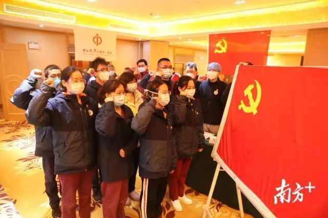 3月2日,中山大学附属第一医院驰援武汉医疗队14名“火线”入党的新党员,面向党旗庄严宣誓。14位新党员中,有8位已在汉口医院支援一月有余,6位在协和医院西院区的支援也即将“满月”。这段时间以来,他们在抗疫前线面对繁重工作,勇担重任,迎难而上,经受住了抗疫战争严峻的考验,彰显了共产党员的责任担当。