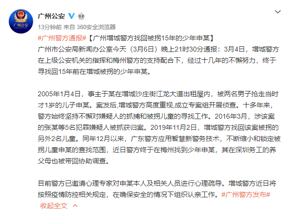 广州市公安局新闻办公室3月6日21时30分通报:3月4日,增城警方在上级公安机关的指挥和梅州警方的支持配合下,经过十几年的不懈努力,终于寻找回15年前在增城被拐的少年申某。