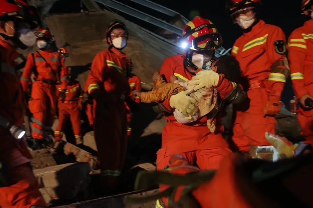 7日23时01分,在厦门市消防救援支队的作业区域内,搜救犬突然对着一处缝隙吠叫起来,“这下面可能有人!”消防救援人员迅速带来另一条搜救犬,对疑似点进行二次确认,果然,下面有被困者。经过生命探测仪进一步探测和听敲击回声,消防救援人员确定了被困人员的位置。为不给被困人员造成二次伤害,又能够迅速把他们救出来,消防救援人员决定以“先纵向下探,后横向掘进”的办法,避开被困人员的正上方进行破拆作业,开辟出生命通道,直通受困人员位置。“快!这里有孩子!”通道打开后,被困人员向救援人员发出呼救声。消防员胡军、洪洛、汤立敏先后进入通道内,通过交替接力的方式,经过一个多小时艰苦救援,一个约莫两周岁左右的小男孩被救了出来。