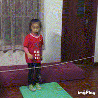 7. 跨障碍物(跨栏)动作要领:父母用绳子做一个栏架,一头爸爸拉着,一头妈妈拉着,高度根据孩子的身高和腿长,一开始低一点,让孩子跨过去,先抬高一条腿,跨过去,然后另一条腿再跨,如果孩子的脚勾到绳子,立刻松开绳子,防止勾倒。鼓励孩子抬高腿,不要碰绳子。