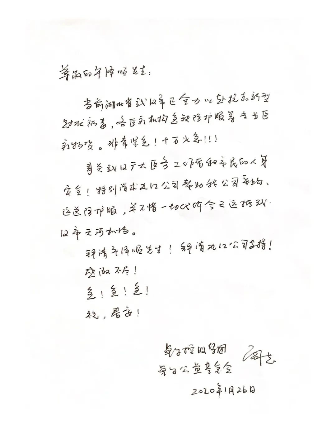 1月26日,面对医疗物资持续紧缺,阎志亲笔致信合作伙伴日本丸红株式会社负责人,告知湖北武汉在防疫抗击中急缺防护服等医疗物资,“事关武汉广大医务工作者和市民生命安全”,请求日方帮助采购、运送防护服,并“不惜一切代价”运抵武汉。