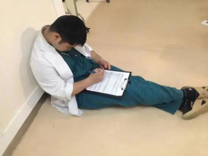 重症监护室是刘凯的主战场,下面这张照片,是刘凯的同事偷拍到的。记录了平常工作中,刘凯监护一名ECMO治疗病人,睡眠太少,在监护室外席地睡着的一幕。