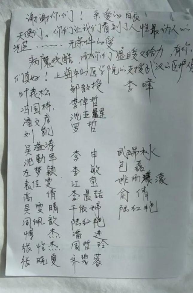 照片是中山医院援鄂医疗队党支部副书记潘文彦护士长拍的。潘文彦告诉记者,写名字的病人,之前非常悲观,几乎不跟任何人说话。经过了解,患者年迈的母亲因新冠肺炎刚刚去世,她的爱人也在其他医院治疗。她沉浸在绝望的情绪中,根本无心治疗。
