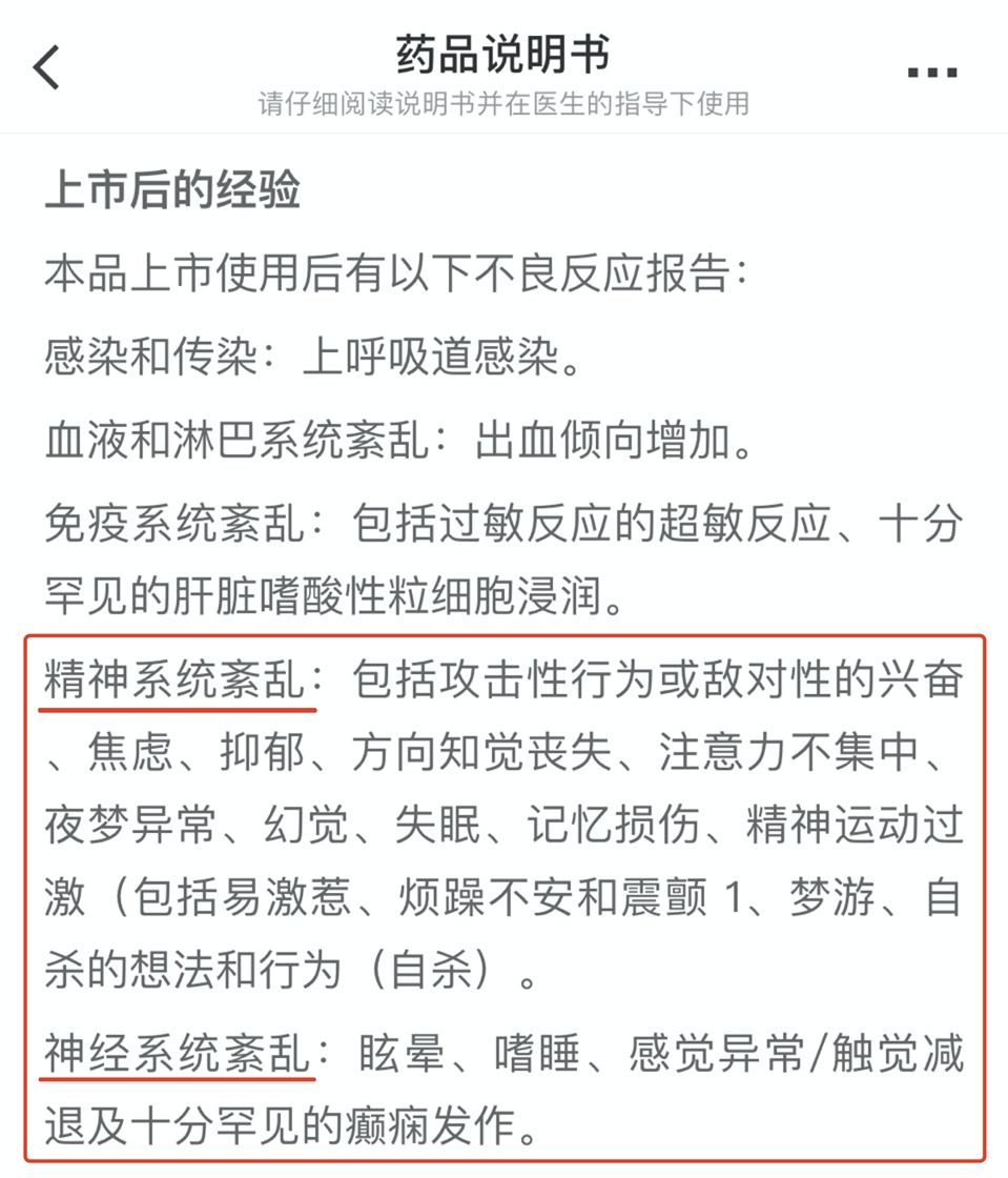 主要是说:随着这个药物在市场上广泛的应用,收集到不良反应的数据也越来越完善。在过去大概 20 年间,这类药物引起严重精神不良反应的数据持续增加,并且有 82 例自杀病例可能和这个药物的使用相关。