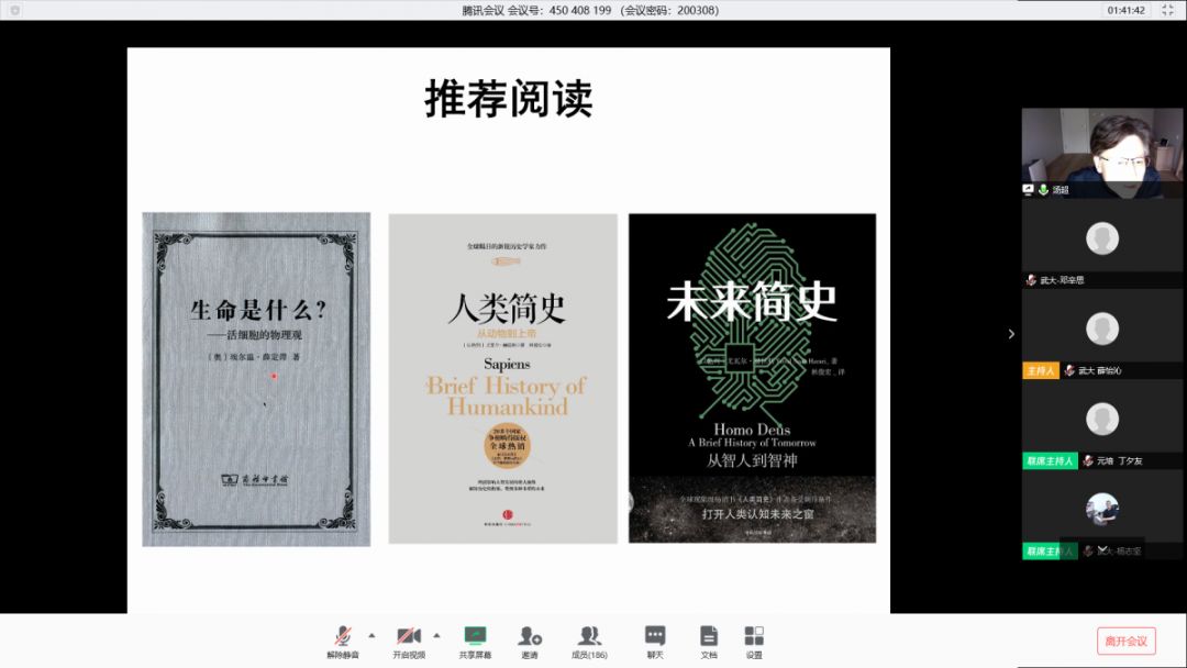 不同于简洁、定量、有数学支持的物理学,生物学是复杂的、描述性的、观察性的,也是其他学科的起源,比如流体力学、微积分、概率论等等都在生命中有所体现,每个生命都具有自己的语言;同时,生命科学的进步很大程度上是站在物理学、数学、化学的肩膀上蓬勃生长的,而这样蓬勃发展的生命科学也必将带来新一波社会革命。汤超院士给同学们推荐了三本读物:《生命是什么》、《未来简史》以及《人类简史》,希望同学们好好研读。