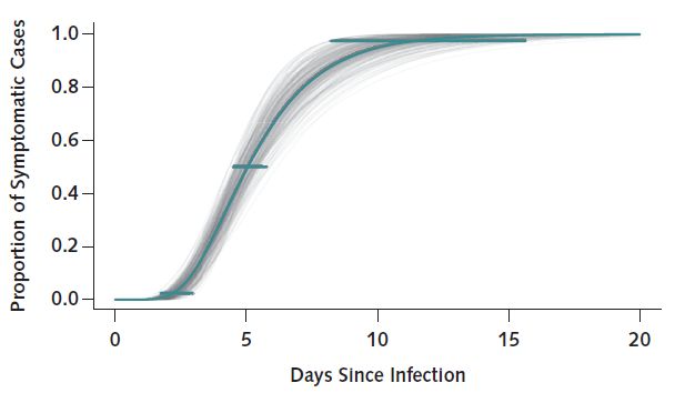约翰霍普金斯大学彭博公共卫生学院3月9日发表在《内科年鉴》(Annals of Internal Medicine)上的一篇论文指出,新冠潜伏期的中位数约为5.1天。只有不到2.5%的感染者会在暴露2.2天内发病,97.5%的新冠感染人群会在暴露11.5天内出现症状。