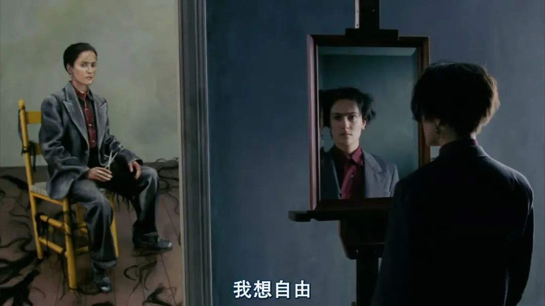 遭遇妹妹和丈夫双重背叛后,她画了一幅自画像,画中的她穿着宽大的西装,拿着剪刀,原本的长发被剪断了,散落一地,她恨自己被那些女性柔情所羁绊、伤害,她渴望新生。