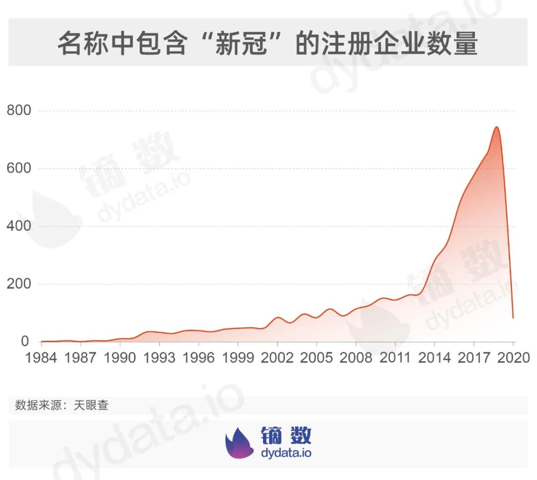通过天眼查数据可以看到19785家公司名字含有“新冠”两个字,尤其是在2019年企业注册数量最多。