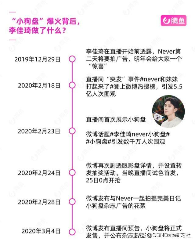 Never的人气基础只是小狗盘爆火的第一步,李佳琦团队持续的造势才是关键。小狗盘首次“出场”是在去年年底的直播里,李佳琦透露Never第二天要去拍广告,但并未说明具体内容,引发了不少网友的好奇。