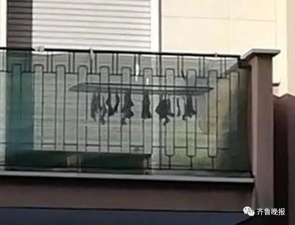 由于那户人家里没有人,警方便派出了无人机在阳台上空拍照,证实确实有好几排肉。他们还看到,有疑似血液的“不明液体”从“蝙蝠干”上滴下来。