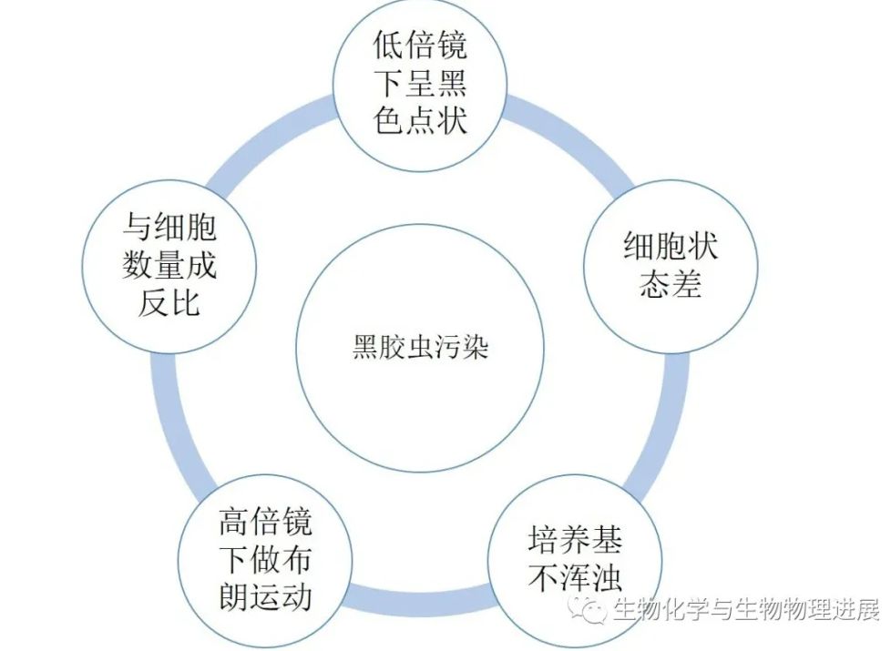 《生物化学与生物物理进展》杂志(PIBB)2020年第1期发表了题为细胞培养中“黑胶虫”污染的检测及防治一文。根据作者描述,“黑胶虫”污染具有以下特征: