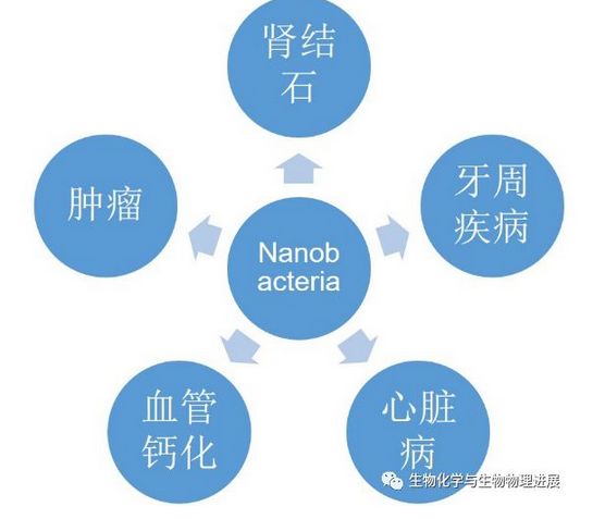 1988年,芬兰科学家Kajander在进行动物细胞培养时发现黑色的小点,而后命名为“Nanobacteria” 。Kajander的研究表明“Nanobacteria”存在于人和牛的血液中,属于变形杆菌(Proteobacteria)α-2亚群,直径大小在0.2-0.5 μm;并且可以作为结晶中心,引起细胞内外钙化和结石形成从而引起肾结石和尿道疾病等[1-2]。Kajander可谓是开启了一个全新领域,众多科学家纷纷投入“Nanobacteria” 与各种疾病的关系的研究中[1-5]: