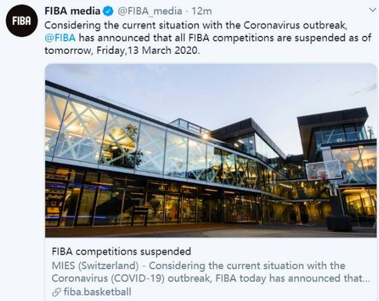 北京时间3月12日,国际篮联官方宣布,考虑到目前新冠疫情在全球范围内爆发,为了保证球员、教练、赛事官员和球迷的健康和安全,所有FIBA赛事将于明日起暂停。今年将举行的奥运会落选赛、U17男女篮世界杯和各大洲杯赛的预选赛都可能受到影响。