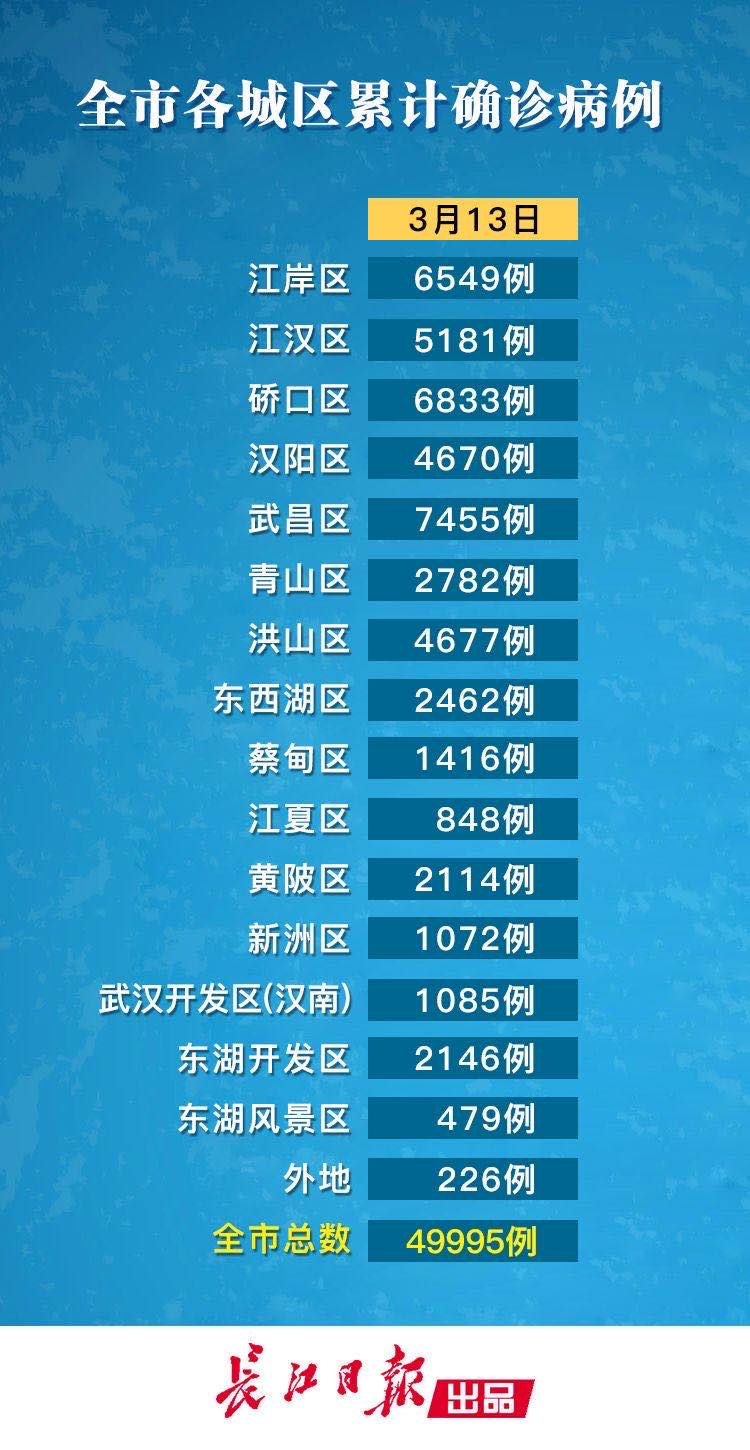截至2020年3月13日24时,全市累计报告确诊病例49995例。其中(大疫情网按现住址统计):