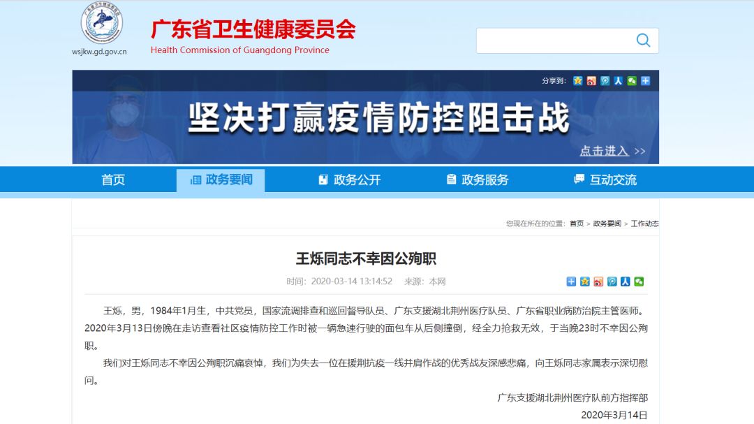 我们对王烁同志不幸因公殉职沉痛哀悼,我们为失去一位在援荆抗疫一线并肩作战的优秀战友深感悲痛,向王烁同志家属表示深切慰问。