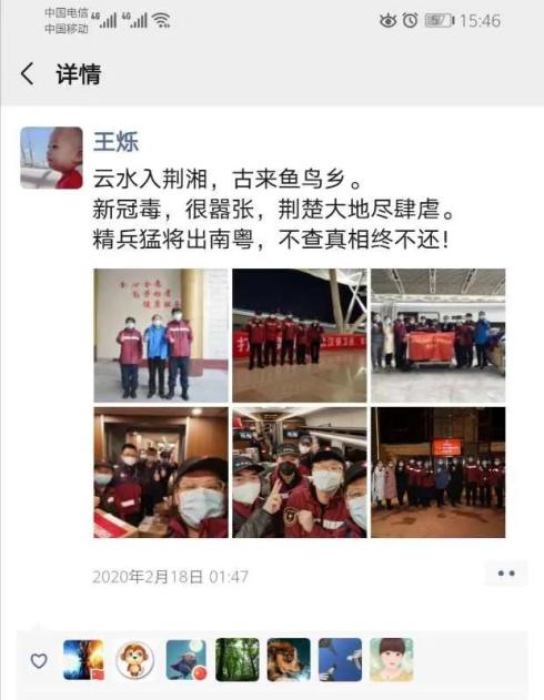 王烁校友是东南大学的骄傲,在他身上集中体现了东大人为家国勇于担当、为人民无私奉献的精神。在他2月18日的微信朋友圈里,曾慨然写到:“云水入荆湘,古来鱼鸟乡。新冠毒,很嚣张,荆楚大地尽肆虐。精兵猛将出南粤,不查真相终不还!”