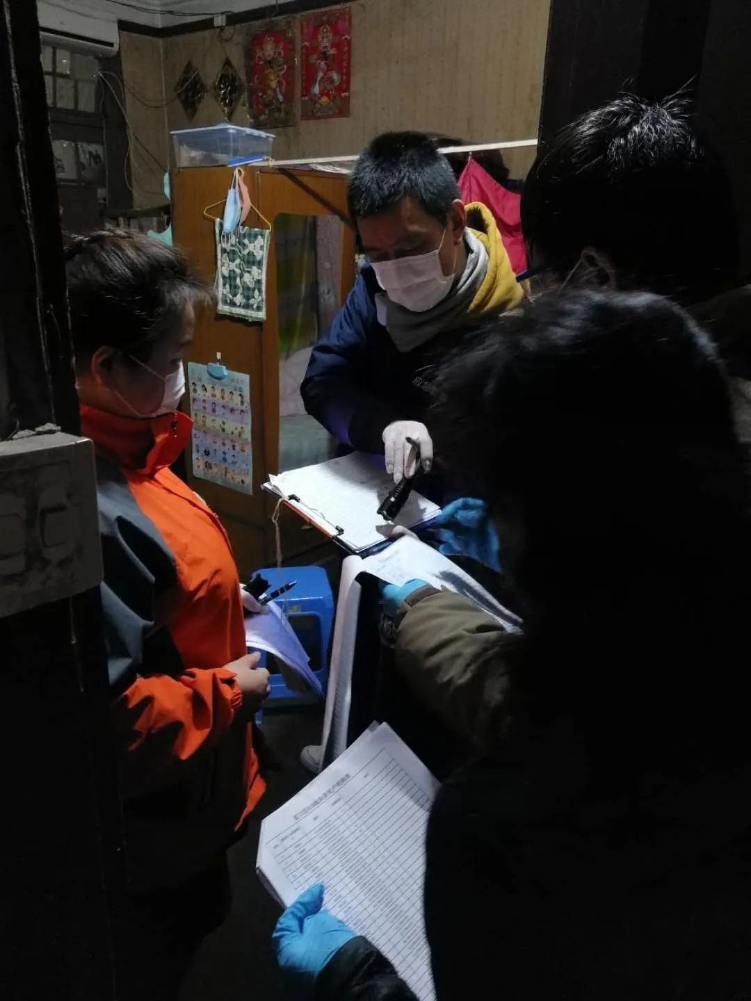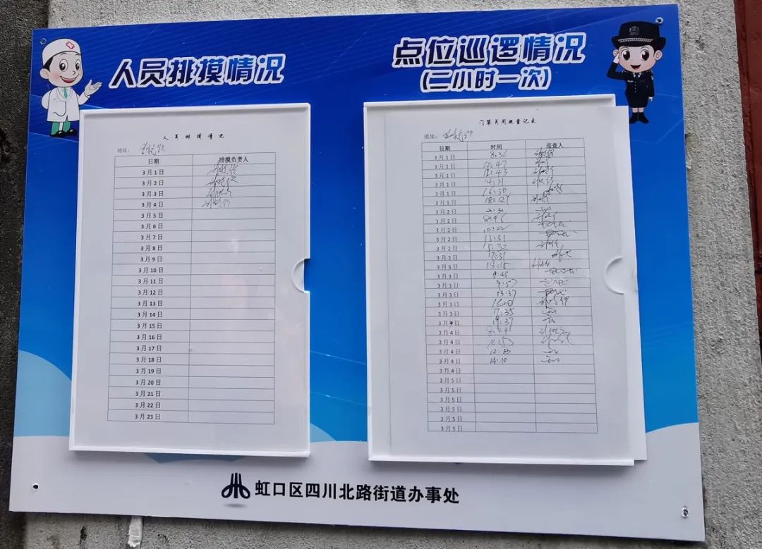 其实,除了墙上标注着的不同颜色的竖条外,还有两张上墙的表格也颇为引人注目。一张是“人员排摸情况”表,另一张则是“门禁关闭巡查记录”表。