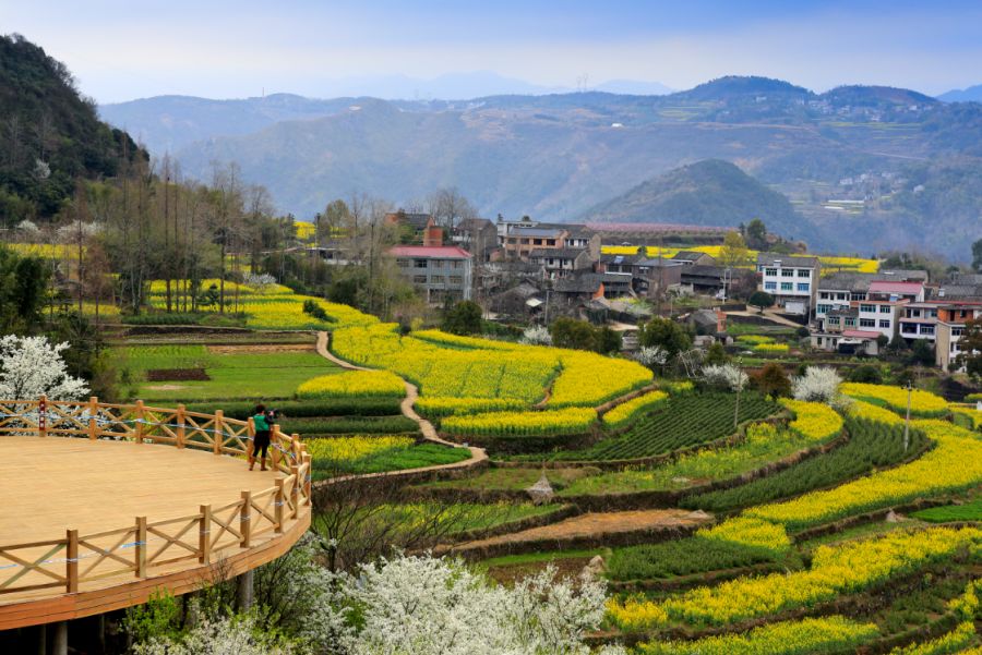 黄金谷栈道是为了让游客多层次、多角度、立体化欣赏梯田金花而设计的观景平台。置身道之上,可以从上帝视角俯瞰黄金满地,将漫山遍野的油菜花尽收眼底。