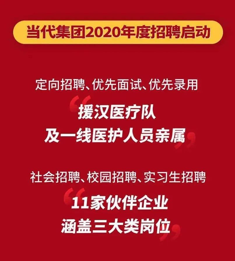 2月26日,当代集团全面启动2020年度招聘,并将优先面试、优先录用援汉医疗队及一线医护人员亲属,为他们提供就业保障。当代集团携人福医药、三特索道、当代明诚、当代地产、当代教育、天盈投资、当代盈泰、当代资源、当代国际及天风证券面向社招人员、应届毕业生及在校大学生提供了三个类型超200个岗位,计划总招聘人数达800余人。短短半月,共收到简历329份,含医护人员亲属简历64份,目前已录用4人。