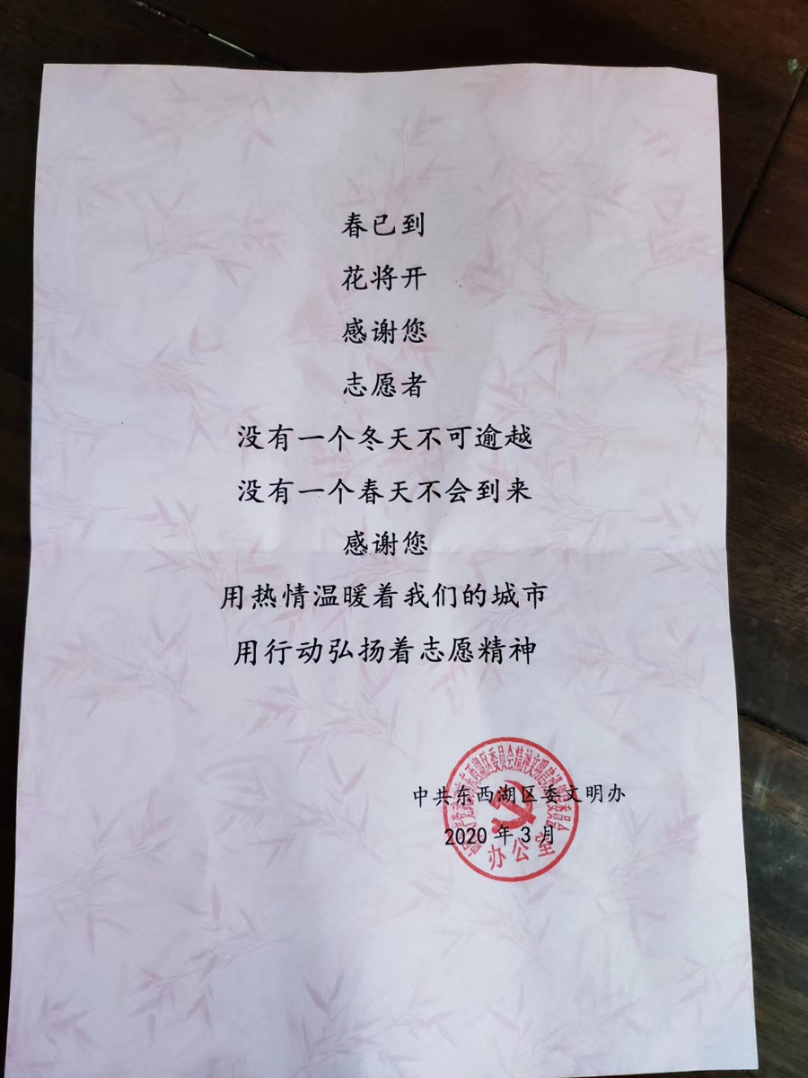 信上写着,“春已到,花将开,感谢您,志愿者,没有一个冬天不可逾越,没有一个春天不会到来。感谢您,用热情温暖着我们的城市,用行动弘扬着志愿精神。”