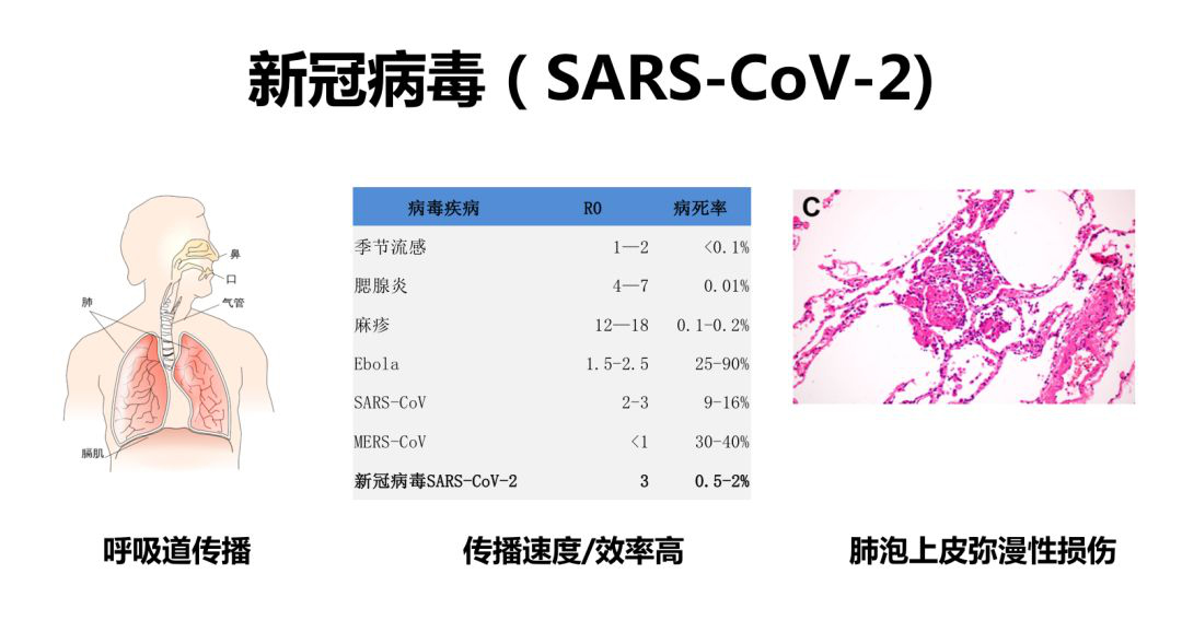 在这次新冠病毒以前已经有6种可感染人的冠状病毒,最早发现的是229E病毒,最晚的是MERS。新冠病毒主要进入人体呼吸道,它的传播效率很高,但是它的病死率并不是很高。它的重要病理特点是有肺泡上皮的弥漫性损伤和多核巨细胞形成。这和病毒侵入最早的一步,也就是受体结合病毒的进入是有关系的。