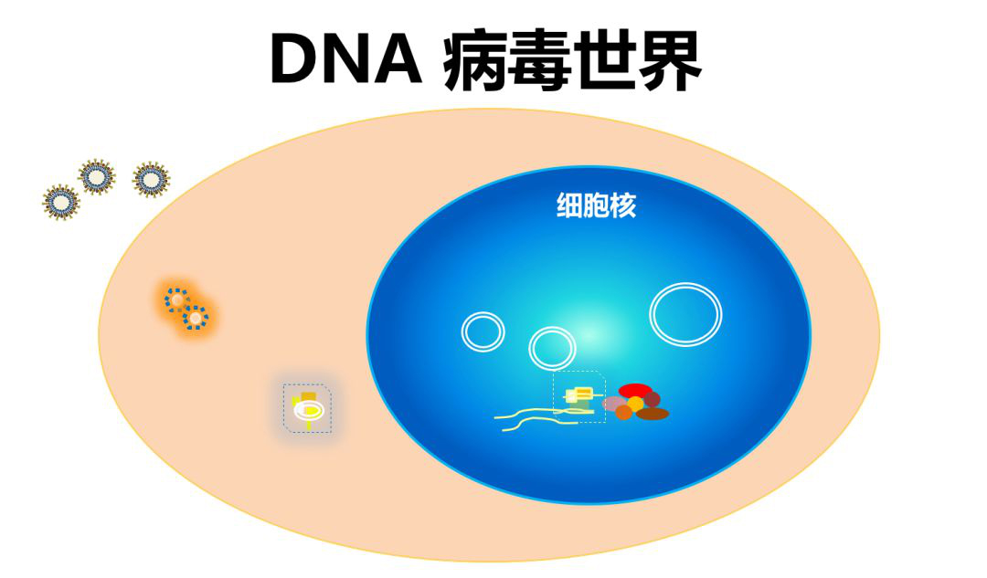 病毒可以分为两大类,存在RNA病毒和DNA病毒两个病毒世界。RNA病毒绝大部分在细胞质内复制,包括此次新型冠状病毒和大部分的新发病毒,以及常见的丙肝等等;绝大部分的DNA病毒都在细胞核内复制,包括常见的疱疹病毒、乳头瘤病毒等等,但也存在在细胞质内复制的DNA病毒,如痘病毒,也就是天花病毒,天花病毒是目前唯一已经被人类疫苗彻底消灭的病毒,其他的病毒即使有很好的疫苗也没有完全根除。在这两个病毒世界之间,还有一种跨界病毒,通过从RNA到DNA的逆转录的过程实现复制,如:HIV和HBV。病毒用最精简的方式复制,携带的核心是它的遗传物质,它的遗传物质在哪儿复制,是整个病毒生命的核心和最关键的要素。