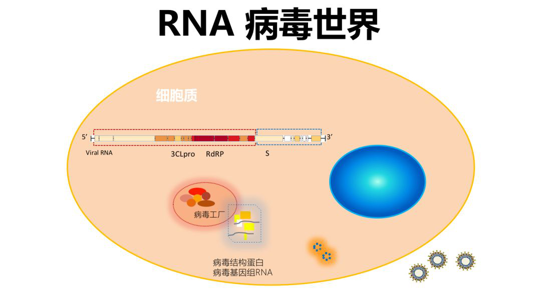对于RNA病毒,它在细胞质内复制,病毒的基因组大致包括两部分,一是它的复制酶区域,二是它的结构基因区域。例如冠状病毒,它的基因组是一个长的正链RNA,翻译产生不同的蛋白质。基因组各部分保守性不同,图上红色区域表示保守性非常高,颜色递减表示保守性减弱。RNA病毒进入细胞后可在“病毒工厂”中,进行基因复制和基因表达,产生病毒结构蛋白和基因组RNA,两者组装成完整RNA病毒以后释放,至此完成它自己的生活史。