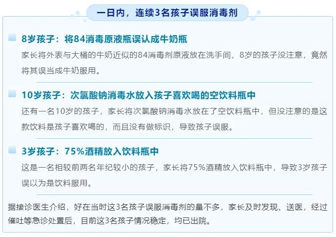 近日,在大连市儿童医院急诊室一日内就连续接诊了3名将消毒剂当成饮料误服的孩子因抢救及时3名孩子并无大碍。