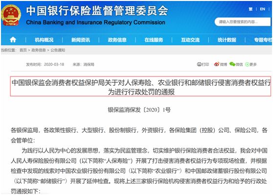 3月18日,银保监会公告了2020年1-3号行政处罚决定书(银保监罚决字〔2020〕1号、2号、3号),三张罚单互有关联,因在打击侵害消费者权益行为专项现场检查中发现人保寿险的问题,连带合作的农业银行、邮储银行也被检查出不少问题,因而一并处罚。