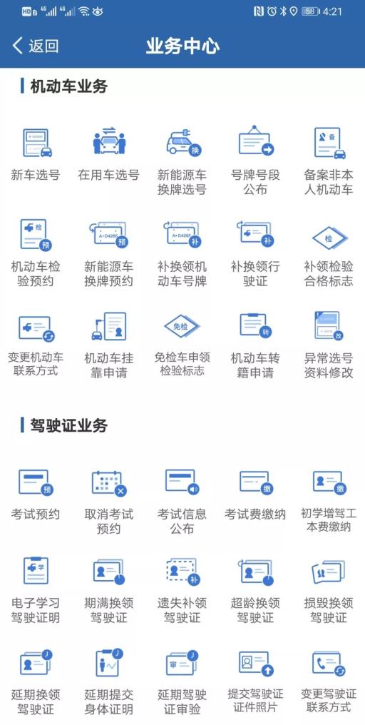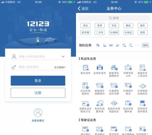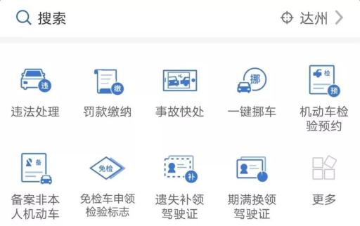 2、交管业务预约/受理/办理:机动车选号、补换领机动车号牌、补换领机动车行驶证、补领机动车检验合格标志、免检车申领检验标志、提交驾驶证照片、期满换证、损毁换证、遗失补证、超龄换证、考试预约、取消考试预约、考试费缴纳、延期换证、延期审验、延期提交身体条件证明、交通违法处理、罚款缴纳、事故快处、一键挪车、备案非本人机动车等。