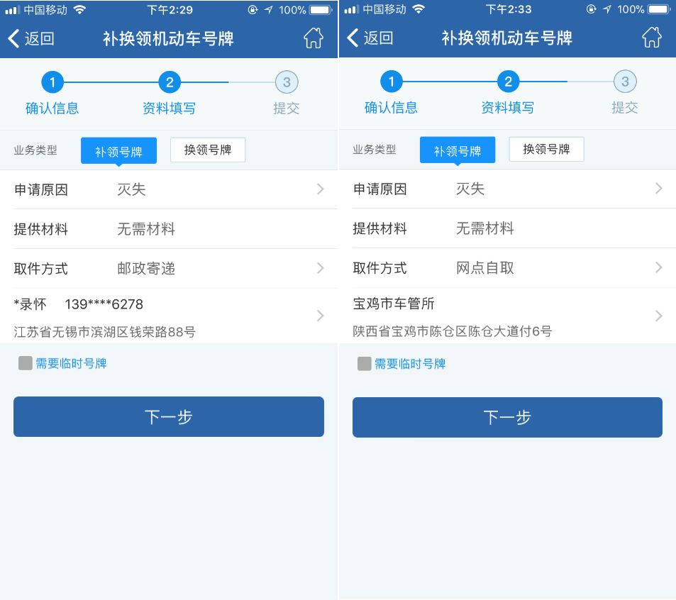 资料填写完成后,点击【下一步】,进入补换领号牌提交页面,确认所填资料信息无误后,获取手机短信验证码,核验通过,点击【提交】按钮,完成补换领牌证业务申请信息提交。提交成功后,用户可通过【首页】→【网办进度】功能随时查看业务办理进度,车管所工作人员将在1个工作日内完成业务受理。