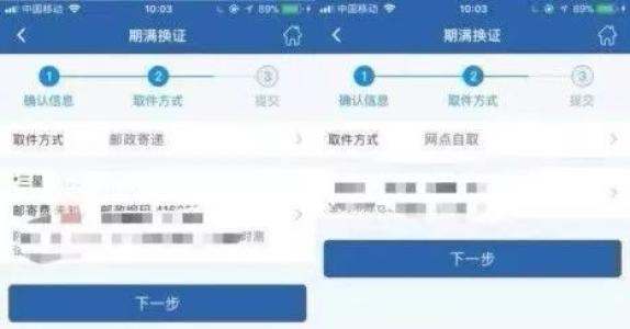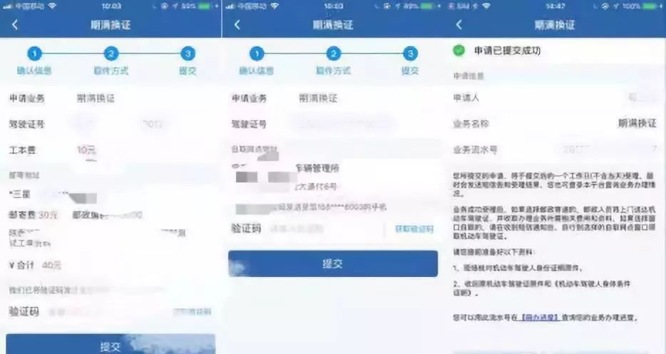 取件方式确认后,点击 【下一步】 ,进入期满换证提交页面,再次确认所填资料信息无误后,获取手机短信验证码,核验通过后,点击【提交】按钮,完成期满换证业务申请信息提交。提交成功后,您可通过 【首页】 - 【网办进度】 功能随时查看业务办理进度,网办中心工作人员将在1个工作日内受理您的业务。1、对于选择邮寄的,邮政工作人员会将新驾驶证快递到您填写的收件地址处。2、对于选择自取的,需自行前往自取服务网点现场领取新驾驶证。
