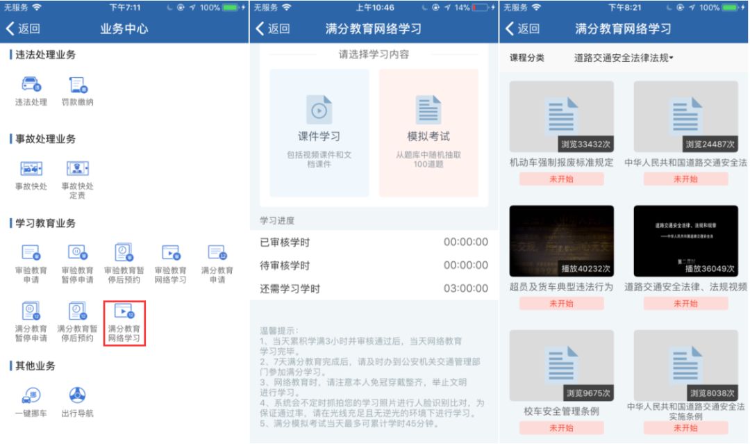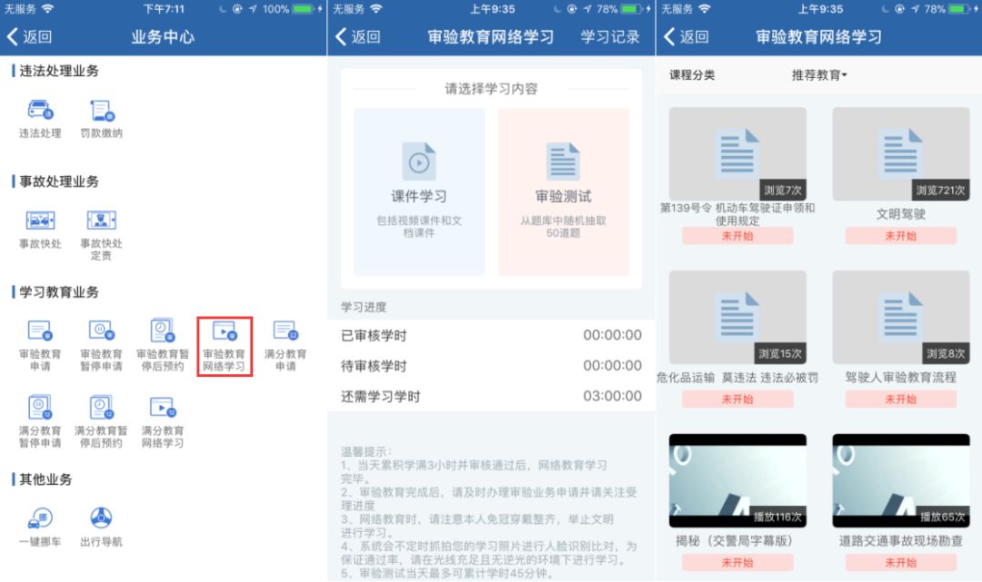 一、申请参加网络教育时,请按要求进行至少3小时的网络学习,学习过程中,请注意本人免冠且穿戴整齐,举止文明进行学习。建议您在光线充足的环境中学习,系统会不定时抓取您的学习状态。您累积学满3小时后,由交管部门负责审核,审核后若您的已审核学习时间不满足3小时的,学习时间作废。
