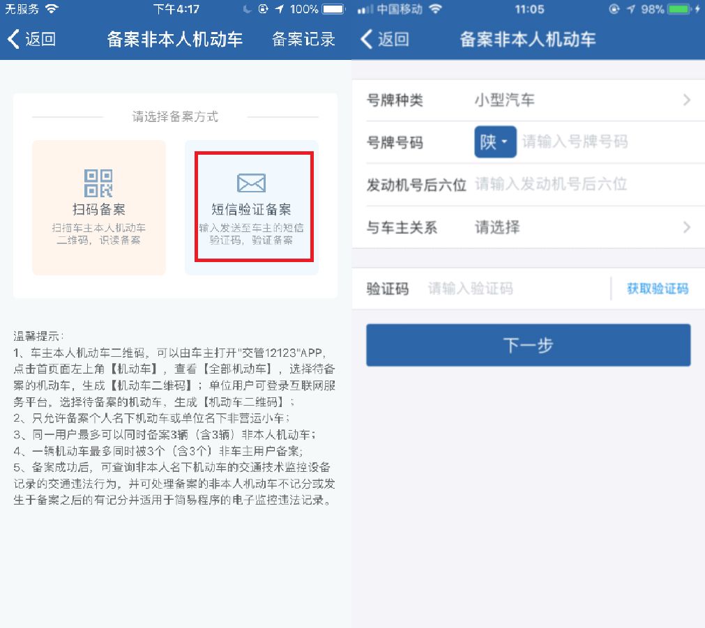 采用“短信验证备案”的,用户输入需要备案的非本人机动车的号牌种类、号牌号码、发动机号后六位等信息后,系统将发送短信验证码至车主手机号码(车主可以是非互联网平台注册用户),申请用户输入车主收到短信验证码。