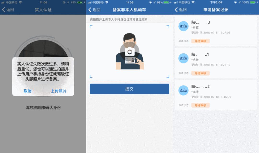 用户扫码或输入短信验证码通过后,对于已启用公安部可信身份认证的,用户进行“实人认证”,“实人认证”通过的,备案申请提交成功。