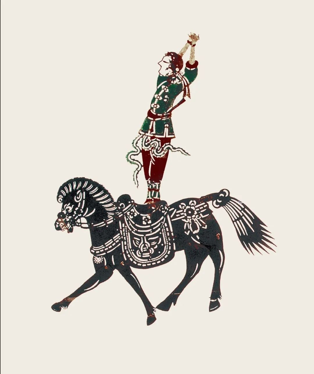 身段和头梢之外,皮影戏的景片之丰富,远胜戏曲一桌二椅的“空舞台”,如《图录》所收“地狱刑罚”类,抽肠剖腹,栩栩如生,观之确有惧意。皮影戏的“人神骑靠”,无须如戏曲舞台以鞭示意跨马驰骋,而是细腻刻画坐骑与骑士,更是将其美术性充分发挥出来。故而,目前尚活态留存的皮影戏特长于表现光怪陆离的神魔传奇题材。《封神榜》故事中阐截二教斗法时,各路神仙与他们的四不像、金眼骆驼、麒麟、青牛、梅花鹿、黑虎等坐骑,活灵活现展现在观众面前,是何等的神奇美妙。